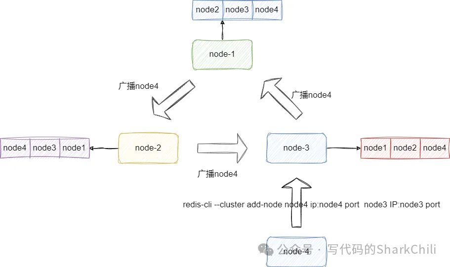 此时,我们需要横向扩展一个节点4,我们只需配置/redis-cli --cluster add-node 新节点IP:新节点端口 任意存活节点IP:任意存活节点端口,这个存活节点后续和其他节点通信时,就会将当前新添加的节点4发送出去,由此其他节点收到这个消息并存储下来,经过各个节点的不断反复通信,这个集群中的各个节点就会拥有集群中所有节点的信息。