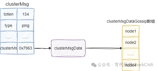 union clusterMsgData { //可以发送ping meet pong的消息,该结构体内部有clusterMsgDataGossip数组,这意味这个结构体可以存放多个节点的消息 struct { /* Array of N clusterMsgDataGossip structures */ clusterMsgDataGossip gossip[1]; } ping; //...... };1.2.3.4.5.6.7.8.9.