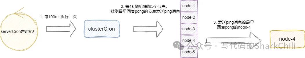 集群节点的指向流程也是交由redis的时间事件serverCron执行,它会每个100ms执行一次集群的定任务clusterCron方法,其内部会检查这个定时任务是否执行了10次,一旦执行10次(也就是100ms*10即每1秒)后就会随机从当前节点维护的其他节点信息字典表中抽取5个节点,找到最早回复pong给当前节点发送一条ping消息: