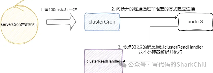 每个集群的节点都会定时检查和对端链接的连接是否断开,如果断开的尝试异步非阻塞向其发送建立连接请求,并注册一个处理器clusterReadHandler处理对端的ping等消息,所以我们上文的ping消息实际上就是通过这个函数进行解析读取:
