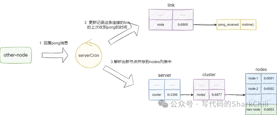 新节点通过meet和集群中某个节点a建立连接。当前节点执行clusterCron定时任务时,随机抽取5个节点并找到最早回复pong的实例,假设是节点a,发送ping消息。注册clusterReadHandler处理器其他节点发送的消息。收到节点a的pong消息回复,判断查看该节点是否是已知节点,如果是则调用clusterProcessGossipSection解析报文内容,如果存在新节点则进行握手通信,如果连接建立成功则将该节点存入当前实例的nodes节点中。