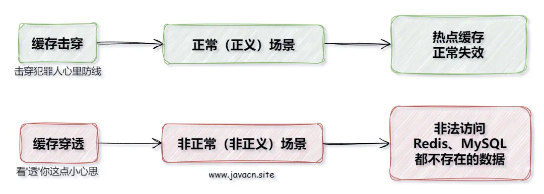 缓存击穿 ->正常的数据失效引发的问题。缓存穿透 ->非正常的数据访问引发的问题。就像警察叔叔审讯犯人一样,我们可以用“击穿犯罪嫌疑人的心里防线”,但不能用“穿透犯罪嫌疑的心里防线”,所以,击穿是“正义之词”,而穿透是“非正义之词”,例如,你这点小心思,我还看不“透”,“透”这个词通常是用来描述不好的事情的,因此我们可以使用这个技巧来彻底区分缓存击穿和缓存穿透了,如下图所示: