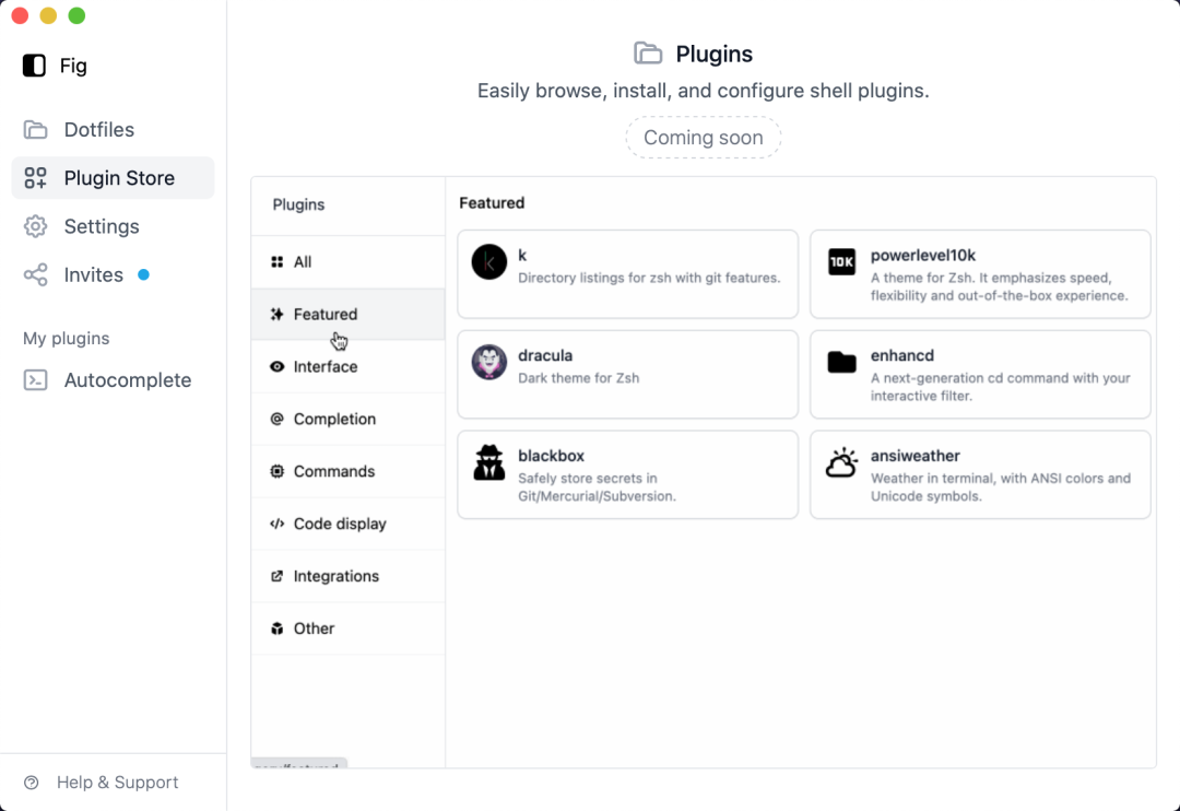 Fig 的软件中还有插件商店,不过还没正式上线,但是也能看出 Fig 官方接下来的路线,插件功能必然会对 Fig 提供更多的功能。