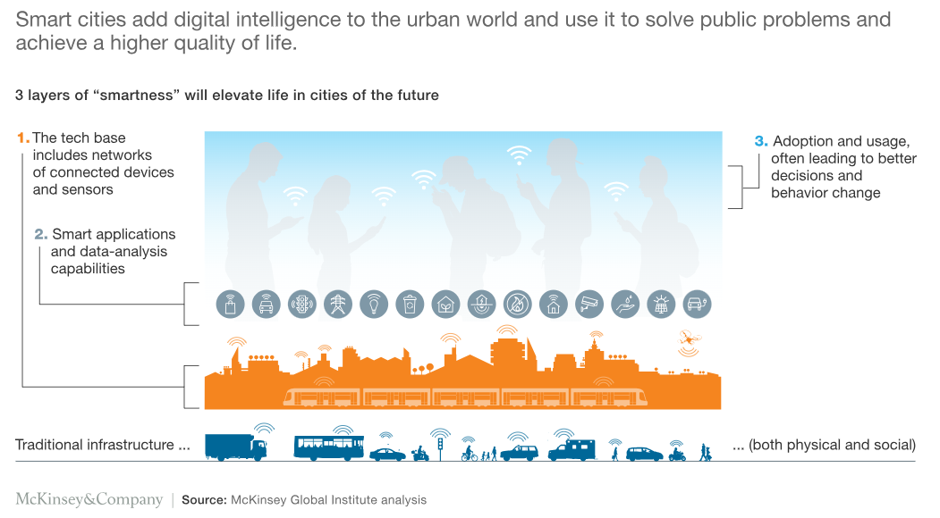 生活质量有很多方面,从居民呼吸的空气到他们在街上行走的安全感。 麦肯锡全球研究院 (MGI) 的最新报告《智慧城市:打造更宜居未来的数字解决方案》(PDF-6MB) 分析了数十种数字应用程序如何解决这些实际且非常人性化的问题。 研究发现,城市可以利用智能技术将一些关键的生活质量指标提高 10% 至 30%,这些数字可以转化为挽救生命、减少犯罪事件、缩短通勤时间、减轻健康负担和避免碳排放。