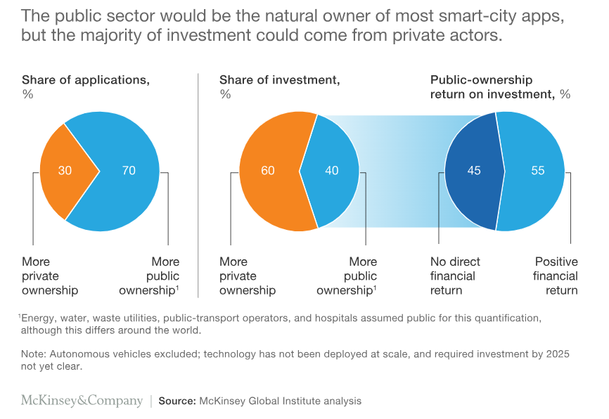 市政府不必是每种类型的服务和基础设施系统的唯一资助者和运营商。 虽然我们研究的大部分应用程序的实施将由公共部门负责,但大部分初始投资可能来自私人参与者(图表 2)。 公共资金只能用于那些必须由政府提供的公共产品。 此外,公共部门需要进行的初始投资的一半以上将产生积极的财务回报,这为合作伙伴关系打开了大门。