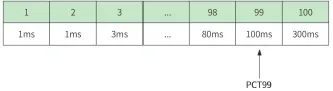 冰河推荐的系统性能的衡量指标是响应时间PCTn统计方式,PCTn表示请求响 应时间按从小到大排序后第n分位的响应时间。假设在一段时间内100个请求的响应时间从小到大排序如图所示,则第99分位的响应时间是100ms,即PCT99= 100ms。