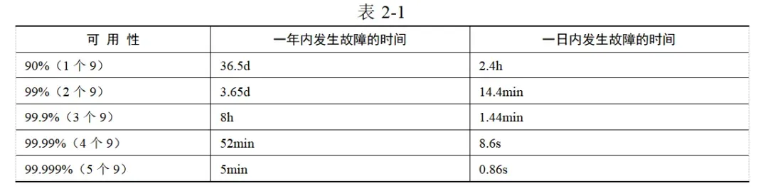 2. 高可用性指标可用性=系统正常运行时间/系统总运行时间,表示一个系统正常运行的时间占比,也可以将其理解为一个系统对外可用的概率。我们一般使用N个9来描述系统的可用性如何,如表所示。
