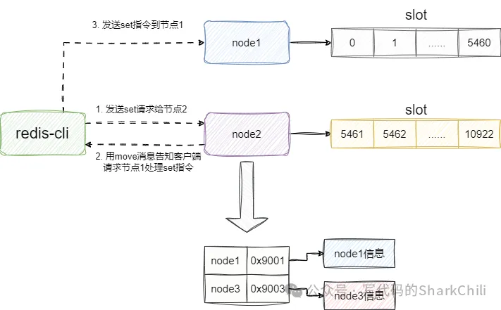 假设我们现在集群中有个节点,每个节点各自负责一部分槽,此时我们的客户端向节点2发起一个set指令,而该指令对应的key应该是要存放到节点1中,对此节点2的做法是查看自己所维护的节点列表是否有负责该slot的节点,如果发现了而回复给客户端move指令,告知客户端到指令的ip端口的节点进行键值对存储:
