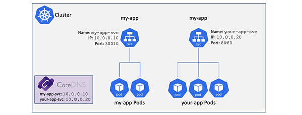 DNS 中注册的名称就是 metadata.name,而 ClusterIP 则由 Kubernetes 自行分配。