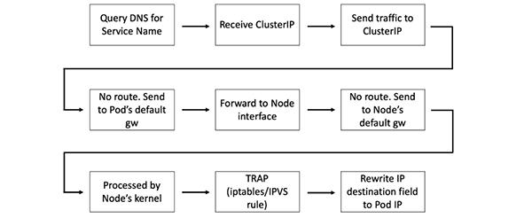 一个 Pod 需要用 Service 连接其它 Pod。首先向集群 DNS 发出查询,把 Service 名称解析为 ClusterIP,然后把流量发送给位于 Service 网络的 ClusterIP 上。