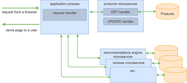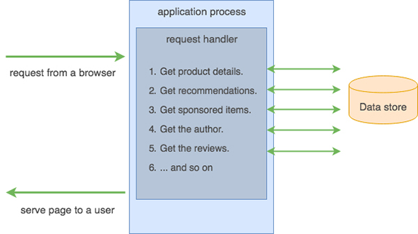 当用户的请求来自浏览器时,它将由 Web 应用程序(Linux 或 Windows 进程)提供服务。通常,被调用的应用程序代码片段称为请求处理程序。处理程序内部的逻辑将依次多次调用数据库,获取呈现页面所需的信息并将其拼接在一起,然后呈现返回给用户的网页。很简单吧?事实上,许多 Ruby on Rails 书籍都有类似这样的教程和示例。那么,你可能会问,为什么要把事情复杂化?