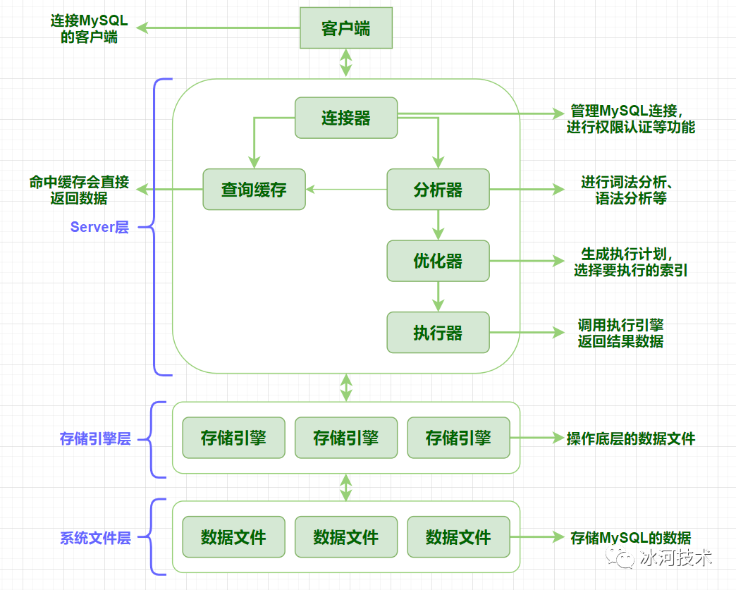 在上图中,我们简单的画了下MySQL的逻辑架构图,并且给出了逻辑分层和每层中各部分的功能。从逻辑上,我们可以将MySQL粗略地分成三层:Server层、存储引擎层和系统文件层,而Server层中又可以分成网络连接层(连接器)和数据服务层(Server层)。