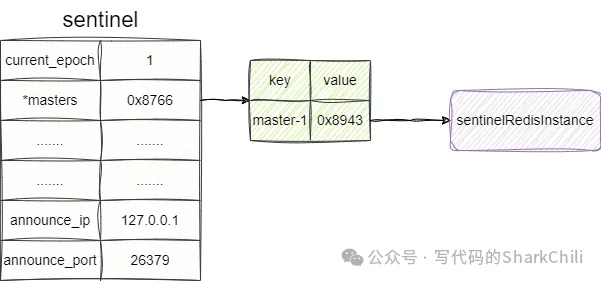 通过current_epoch记录当前选举的纪元。用masters指针所指向的字典维护当前哨兵监听的master节点信息,每个master都会以sentinelRedisInstance结构体进行信息维护各自的name、slave等信息。通过announce_ip和announce_port用于和其他哨兵联系时提供自身的地址信息。