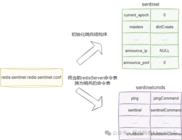 redis在启动会检查本次启动是否是通过redis-sentinel指令或者--sentinel参数启动哨兵,如果是则按照哨兵模式进行初始化,默认给该节点端口号为26379并初始化哨兵sentinel: