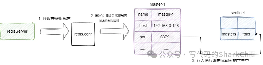 redis就会从配置文件中匹配到sentinel 这个代码段,然后解析出<name> <host> <port> <quorum>这几个参数,生成一个master即可sentinelRedisInstance对象,存入masters这个字典中: