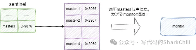 其内部调用sentinelGenerateInitialMonitorEvents遍历masters表的信息将master发布到monitor频道上: