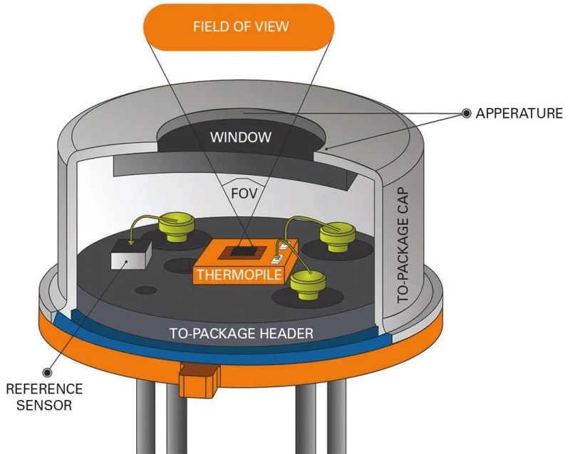 其封装在小型TO-5或TO-18密封外壳中,可以轻松安装在PC板上。热电堆是硅芯片上数十或数百个热电偶元件的微型阵列。该芯片的设计使其顶部的结点暴露在传入的红外辐射下,而背面则连接到金属接头并保持在环境温度下。热电偶串联连接,以便其输出相加。信号之和提供了幅度为数十毫伏的可用输出。