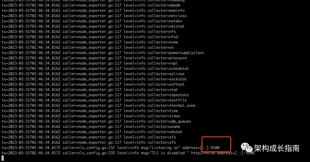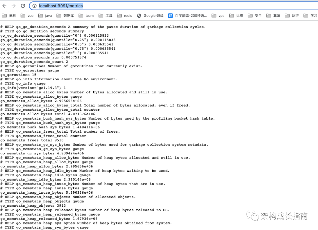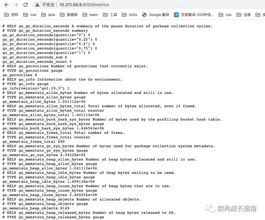 看到以上信息则启动成功,通过浏览器进行访问http://ip:9100/metrics,可以看到以下指标