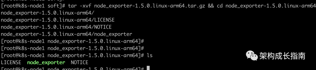 下载完成以后执行tar -xvf node_exporter-1.5.0.linux-arm64.tar.gz && cd node_exporter-1.5.0.linux-arm64进行解压