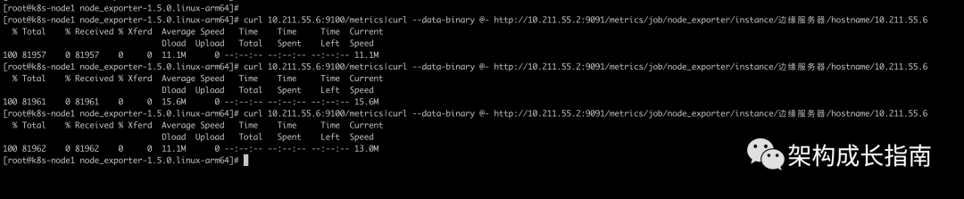 curl 10.211.55.6:9100/metrics|curl --data-binary @- http://10.211.55.2:9091/metrics/job/agent-server/instance/10.211.55.6/hostname/边缘服务器1.
