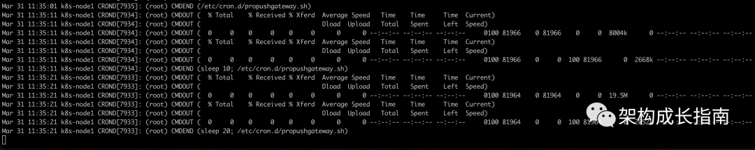 cat <<EOF > /etc/cron.d/propushgateway.sh #!/bin/bash curl 10.211.55.6:9100/metrics|curl --data-binary @- http://10.211.55.2:9091/metrics/job/agent-server/instance/hostname/10.211.55.6 date>> /tmp/date.txt EOF1.2.3.4.5.