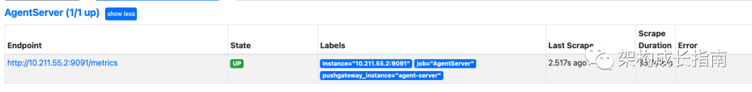 - job_name: AgentServer # Override the global default and scrape targets from this job every 5 seconds. honor_labels: false static_configs: - targets: [10.211.55.2:9091] labels: pushgateway_instance: agent-server ##这里必须加这边标签过滤,不然采集的是pushGateway数据1.2.3.4.5.6.7.