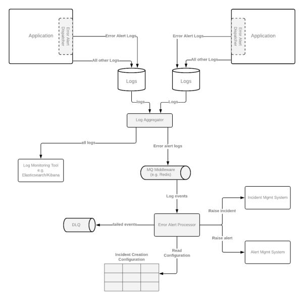 "..other info as needed": "..." }由于大多数组织会使用不同的日志监控技术栈,因此,我在此以日志聚合器(log aggregator)为例,会将各种日志路由到不同的组件处,以便读取日志事件、对应的配置,并按需触发警报。如下图所示,如果出现需要在监控的基础上,去解决被发现的问题时,我们往往需要再次调用DLQ予以处理。