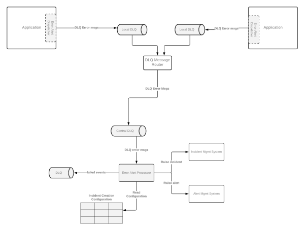 如下图所示,第二种方法是将错误警报的调度程序组件写入DLQ,而非各个日志中,而其他方面则与第一种方法基本相似。也就是说,它是基于DLQ的。