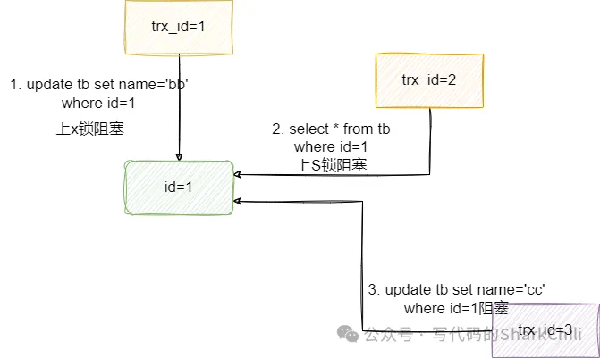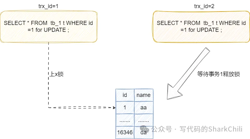 如下图这个说明,假设的我们的事务1先针对id为1的值上了一把写锁,对应事务的SQL如下: