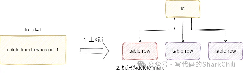 有了上述基础,我们针对x锁对应delete和update操作进行一定的拓展,当事务进行delete的操作时,对应的步骤为: