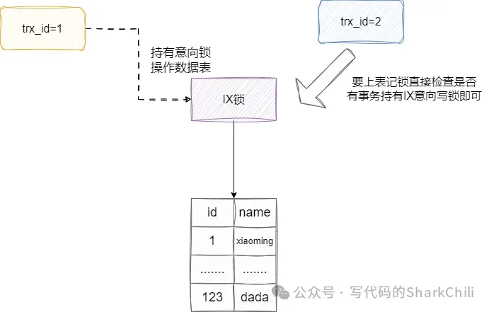 意向锁就是用于解决这个问题的,它是表级锁,在事务需要上读锁(S锁)或者写锁(X锁)前,首先必须取得意向锁,这样某些事务需要上全表锁时,只需要看看有没有事务持有意向锁即可: