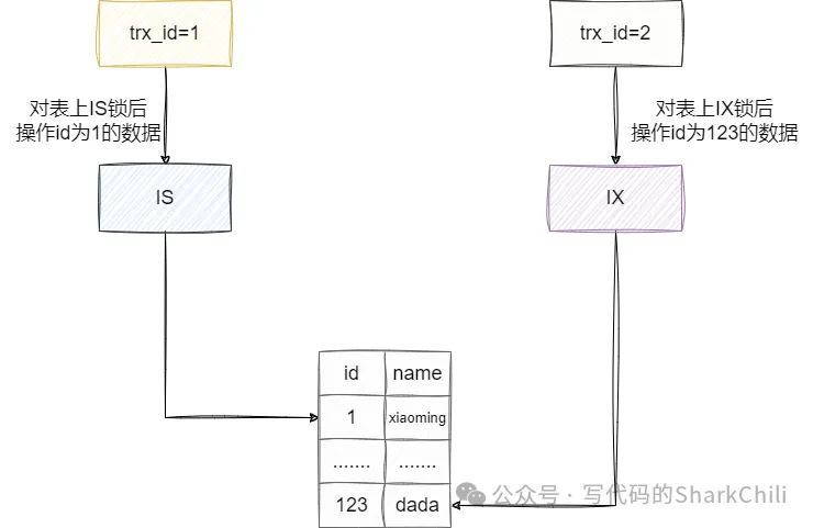 意向共享锁(Intention Shared Lock,IS 锁):当事务需要上S锁时,就需要先尝试获取IS锁。意向排他锁(Intention Exclusive Lock,IX 锁):当事务需要针对某条数据上X锁的时候,就需要先上一把IX锁。 而IS和IX之间互相兼容,彼此不互斥,例如:一个事务上了IS,其他事务同样可以上IS和IX,因为IS本质就是一个共享读锁,某个事务持有这个IS锁之后上的可能是id为1的读锁。不影响其他事务上IS或IX后对id为2的数据上X锁:本质上来说IS和IX锁都是表级锁,它们主要是解决在事务上S锁或者X锁前意向询问来避免扫表的开销,所以彼此之间是兼容的。