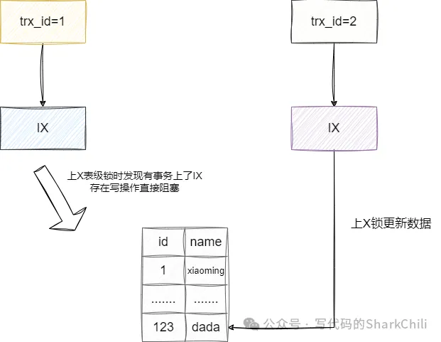 同理假设我们的尝试IX锁进行修改操作,需要针对全表上了X锁,此时我们就需要检查是否有其他事务上了IS或者IX以确定是否存在数据操作,如果有则阻塞等待,这就是IS、IX锁对于数据读写操作的巧妙设计: