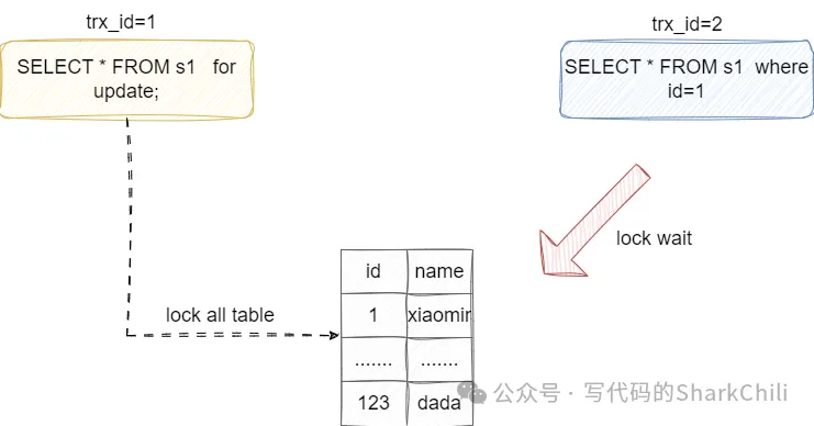 我们都知道行级锁锁的是索引字段,而表级锁锁的是非索引字段,这就意味着如果我们进行update或者delete操作 (这两个操作会上写锁互斥的,后文会说明)时where条件没有命中唯一索引或者索引失效的话,就会上表级锁,进而出现性能问题。