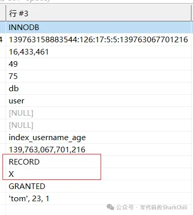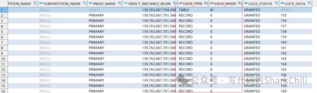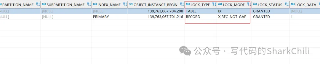 通过performance_schema.data_locks表,可以看到这条该事务上X锁前上了一把IX锁之后,针对这条记录上了X,REC_NOT_GAP即上了一把行级锁,但是不锁住间隙: