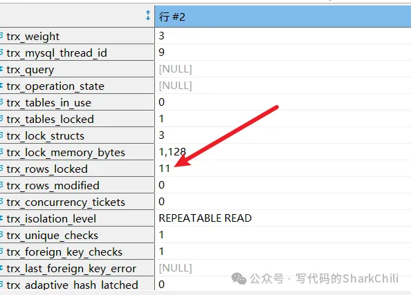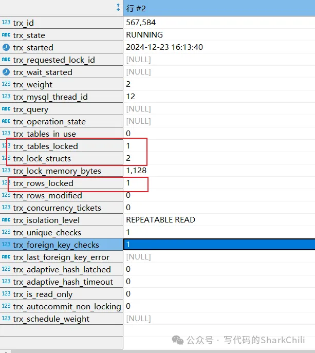 如下图,可以看到我们567584这个事务,这里我们着重查看trx_tables_locked、trx_lock_structs、trx_rows_locked三个字段,其含义分别是: