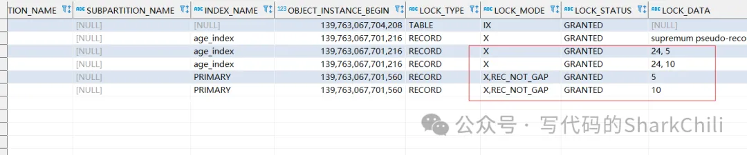 因为年龄上了索引,所以查询时走了范围索引,从performance_schema.data_locks可以看出该操作针对id为5、10这两条年龄为24的数据都上了行级锁和间隙锁,导致数据插入失败: