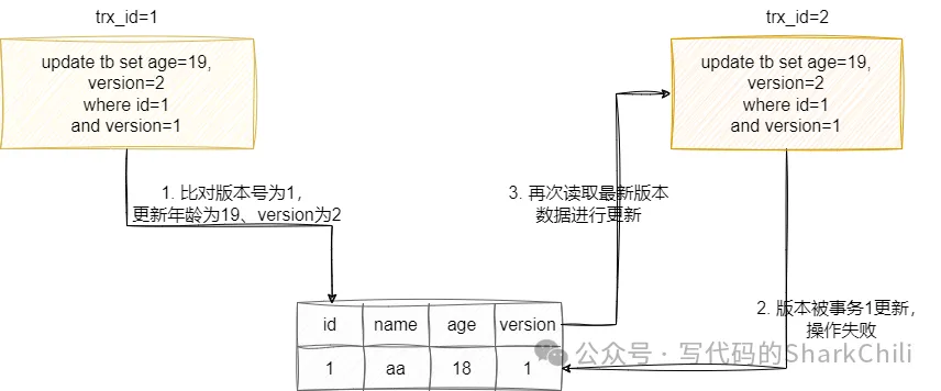 悲观锁就我们上面所说的互斥锁,它认为自己每次拿到的数据都很可能被人修改,通过上锁确保互斥性避免数据一致性问题。在MySQL中select...for update,insert,update、delete语句用的都是用排他锁实现悲观锁。 而乐观锁则是一种业务锁,通过用户手动对表增加一个版本号的字段来解决并发数据正确性问题,如下图所示,某个时间点两个相同的事务读取到相同版本号的当行数据,彼此都执行更新逻辑,为了保证并发更新保证数据准确性,我们就需要通过版本号确保自己更新的数据是最新数据,如下图所示,左边的更新SQL最先执行,这就使得右边的更新失败了,这样右边的事务就知道自己更新条件数据已过期,就会修改版本号再次进行更新。