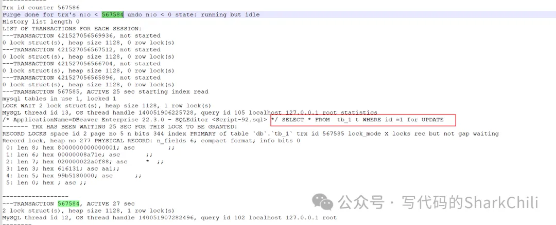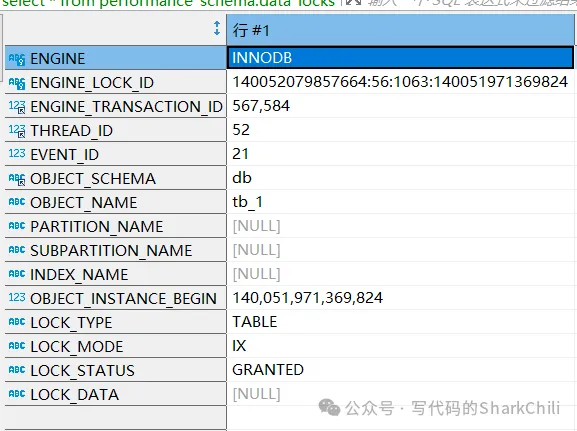 如下图,可以看到567834事务的线程号、事件id以及这个事务在tb_1表上了一把IX意向读锁: