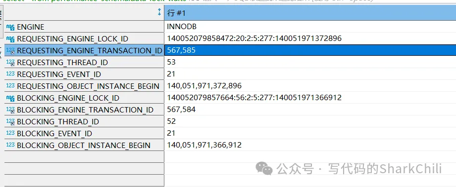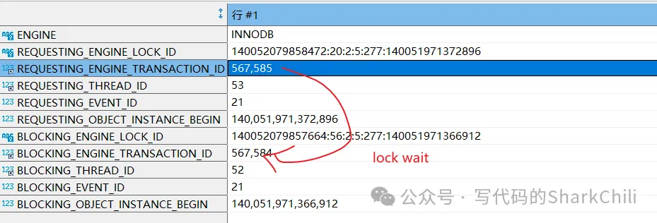 最后再到data_lock_waits可以看到567585的事务等待567584的事务。