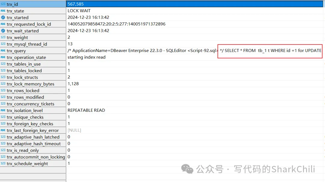 接下来我们就基于上述所说的3张表进行死锁的问题的定位,首先我们查看INNODB_TRX可以看到我们本次SQL的食物号为567585它处于锁等待状态,可以看到它正在执行的SQL语句以及上锁的信息。