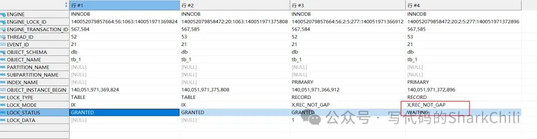 然后我们到data_locks表查看当前数据库的锁情况,这个事务正在等待X锁和REC_NOT_GAP锁,说明这个事务存在死锁:
