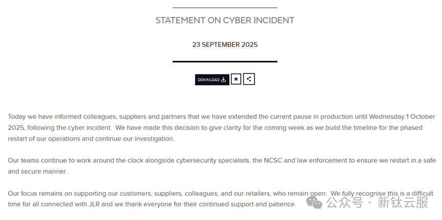 2025年9月2日,捷豹路虎公司发布公告,英国三家工厂3.3万名员工从8月底开始暂停上班。9月23日该公司最新公告,停工至少延续到10月1日。