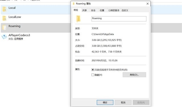 随后点击“AppData”,进入子页面后邮件点击“Roaming”属性,可以看到其中文件是很占空间的。