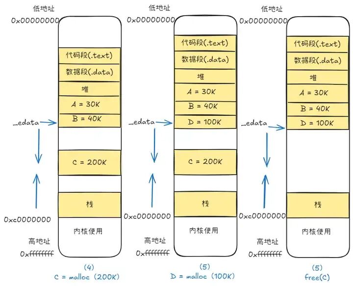 (1)brk/sbrk 调用在 C 语言中,brk和sbrk函数用于操作堆内存。brk函数直接设置堆顶指针,而sbrk函数则是在当前堆顶指针的基础上进行增量调整。下面是一个简单的示例,展示了如何使用sbrk来分配和释放内存: