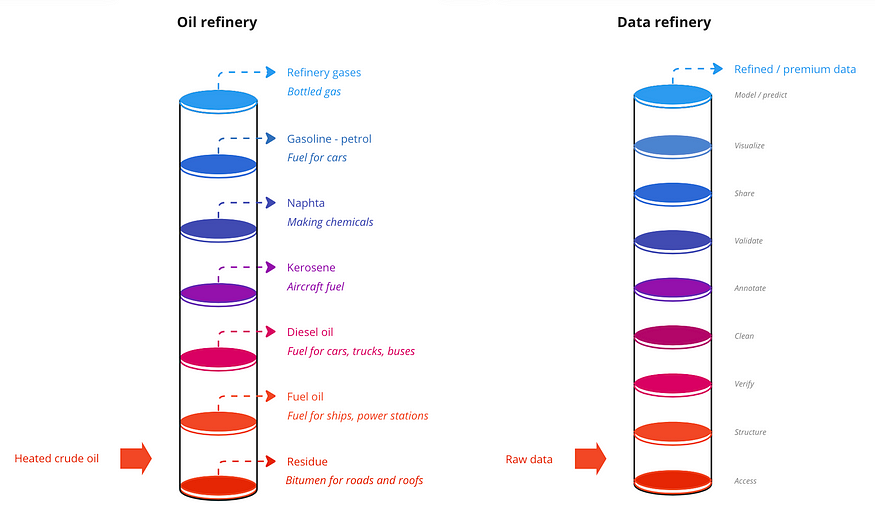 随着数据通过大门,它变得更加精致、更加值得信赖、更加有价值。我们确实可以将这个逐步过程视为“数据精炼厂”,并与炼油厂或蒸馏过程进行类比。