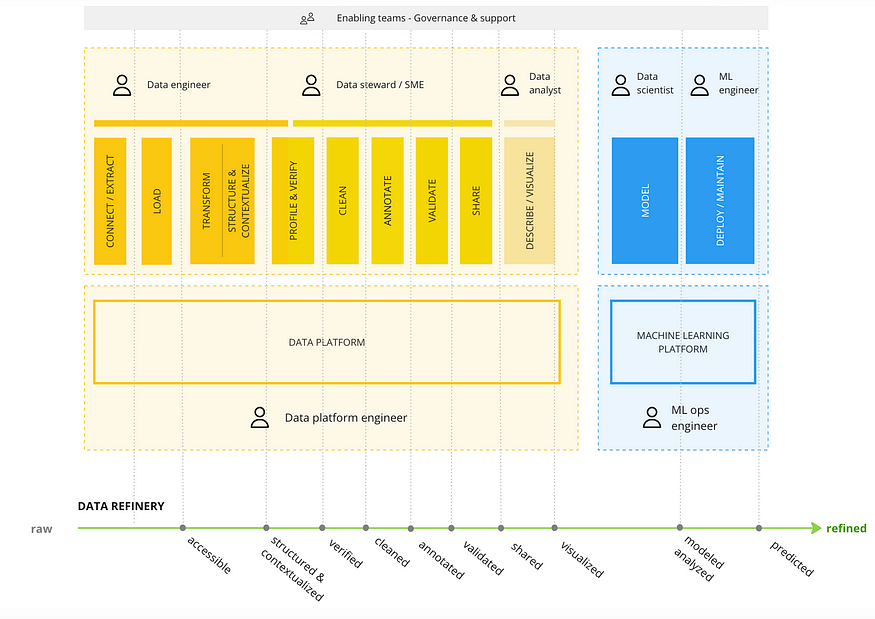数据管道在中间部分,数据工程师设置自动化数据结构化和上下文化的核心管道。然后,数据管理员获取自动化部分的输出,并根据需要进一步清理、注释和验证数据。最终的结果是分析师和数据科学消费者/用户能够以高质量的数据为基础,感到高兴。