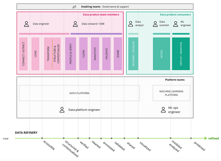 数据工程师和数据管理员是数据产品团队的团队成员。分析师和数据科学家是数据产品团队外部的数据产品消费者。数据基础设施角色是平台团队的一部分,促进多种数据产品的发展。同样,治理和支持团队也发挥着首要的支持作用。由于多种原因,实际情况可能比上图复杂一些: