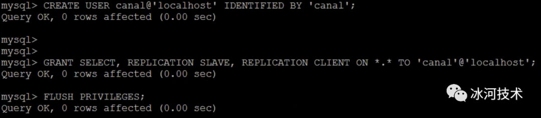 CREATE USER canal@localhost IDENTIFIED BY canal; GRANT SELECT, REPLICATION SLAVE, REPLICATION CLIENT ON *.* TO canal@localhost; FLUSH PRIVILEGES;1.2.3.