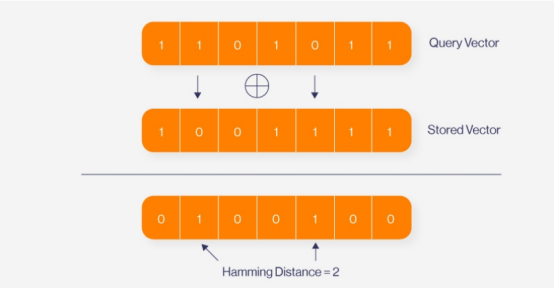二进制量化通过采用二进制代码(0和1)表示向量来增强性能,允许使用汉明距离(Hamming distance)作为相似性度量。汉明距离是使用二进制向量之间的异或(XOR)运算来计算的:XOR在位不同时结果为1,在位相同时结果为0。异或结果中的1的数量表示不同位的数量,提供了一种快速有效的相似性度量。